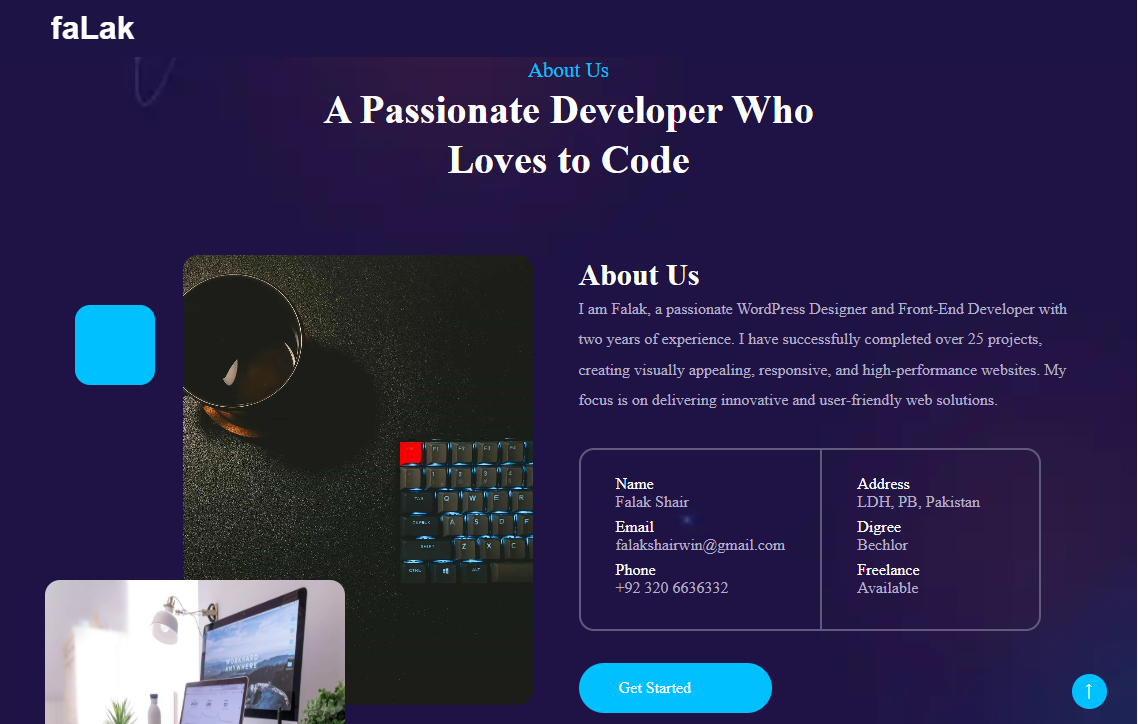I am Falak, a passionate WordPress Developer and Front-End Developer with two years of experience. I have successfully completed over 25 projects, creating visually appealing, responsive, and high-performance websites. My focus is on delivering innovative and user-friendly web solutions.